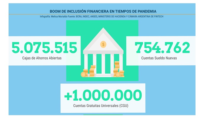 Los programas de inclusión que se vienen ejecutando en el país desde hace años, lograron incorporar a millones de personas al sistema financiero, pero, según la analista Melisa Murialdo, la coyuntura pudo más que cualquier plan financiero: en los 3 meses más fuertes de la pandemia, más de 5 millones de argentinos abrieron cuentas en el sistema financiero. No queda duda de que los programas de ayudas estatales y las estrategias impulsadas por las entidades financieras para apoyar a los argentinos en esta crisis, fueron claves para aumentar el número de personas dentro del circuito financiero, logrando incorporar en un trimestre lo que a los planes de gobierno en condiciones sanitarias normales le llevaba más de un año.